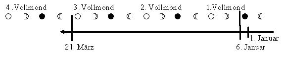 Nimmt man einen Neumond vor oder auf diesem Stichtag, so liegt der 3. Vollmond vor oder auf der Datumsgrenze des 21. März. Will man dies aber bereits am 1. Januar zum Jahresbeginn berechnen, muss man den Mondstand fünf Tage zuvor betrachten. Ist es ein Schaltjahr, ist der Mondlauf von sechs Tagen zu kompensieren. Der Mond wandert jeden Tag um etwa 13° zur Sonne. Will man nun fünf bzw. sechs Tage vor der Neumondgrenze messen, so muss der abnehmende Mond fünf bzw. sechs mal 13° rechts vor der Sonne stehen. Liegt er zwischen 0° und 6 x 13° = 78° , so ist vor bzw. auf dem 6. Januar Neumond. Dann müsste man also einen Mondlauf weiter warten da der 3. Vollmond vor oder auf dem 21. März liegen würde. Befindet sich der Mond am 1. Januar nicht innerhalb dieser Grenze, so wird der 3. Vollmond in die Zeit nach dem 21. März fallen.
