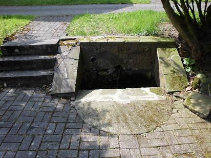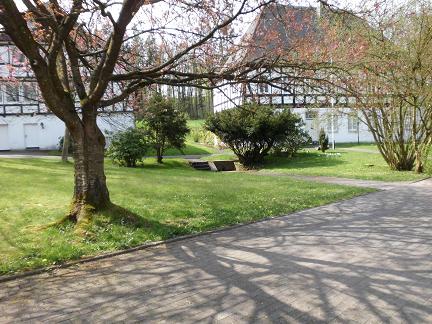 (Links "Walburgahaus", mitte die Quelle "Pastors Strülleken", rechts Pfarrhaus)