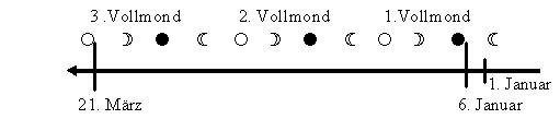 Nimmt man einen Neumond vor oder auf diesem Stichtag, so liegt der 3. Vollmond vor oder auf der Datumsgrenze des 21. März. Will man dies aber bereits am 1. Januar zum Jahresbeginn berechnen, muss man den Mondstand fünf Tage zuvor betrachten. Ist es ein Schaltjahr, ist der Mondlauf von sechs Tagen zu kompensieren. Der Mond wandert jeden Tag um etwa 13° zur Sonne. Will man nun fünf bzw. sechs Tage vor der Neumondgrenze messen, so muss der abnehmende Mond fünf bzw. sechs mal 13° rechts vor der Sonne stehen. Liegt er zwischen 0° und 6 x 13° = 78° , so ist vor bzw. auf dem 6. Januar Neumond. Dann müsste man also einen Mondlauf weiter warten da der 3. Vollmond vor oder auf dem 21. März liegen würde. Befindet sich der Mond am 1. Januar nicht innerhalb dieser Grenze, so wird der 3. Vollmond in die Zeit nach dem 21. März fallen.