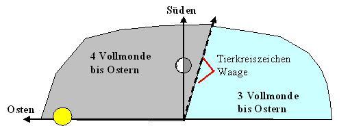 Um nun noch den Winkel zwischen Sonnenaufgang und Erscheinen der Sonne am Horizont zu eliminieren konnte man zusätzlich noch den Standort des Mondes vor einem Tierkreiszeichen als Grenze nehmen. Dies ist das Tierkreiszeichen der Waage. Befindet sich also der Mond zwischen dem Tierkreiszeichen der Waage und der Sonne, welche im Tierkreiszeichen des Steinbock steht, so ist der Mond im relevanten Zeitraum und es sind 4,5 anstatt 3,5 Mondläufe bis zum ersten Frühlingsvollmond nach der Frühlings-Tag- und Nachtgleiche. So gelingt es mit Variablen jenseits der Mathematik die Anzahl der Vollmonde zum Osterfest zu bestimmen. Am Sonntag in der Nähe des nun folgenden 1. Vollmondes beginnt die Vorfastenzeit.